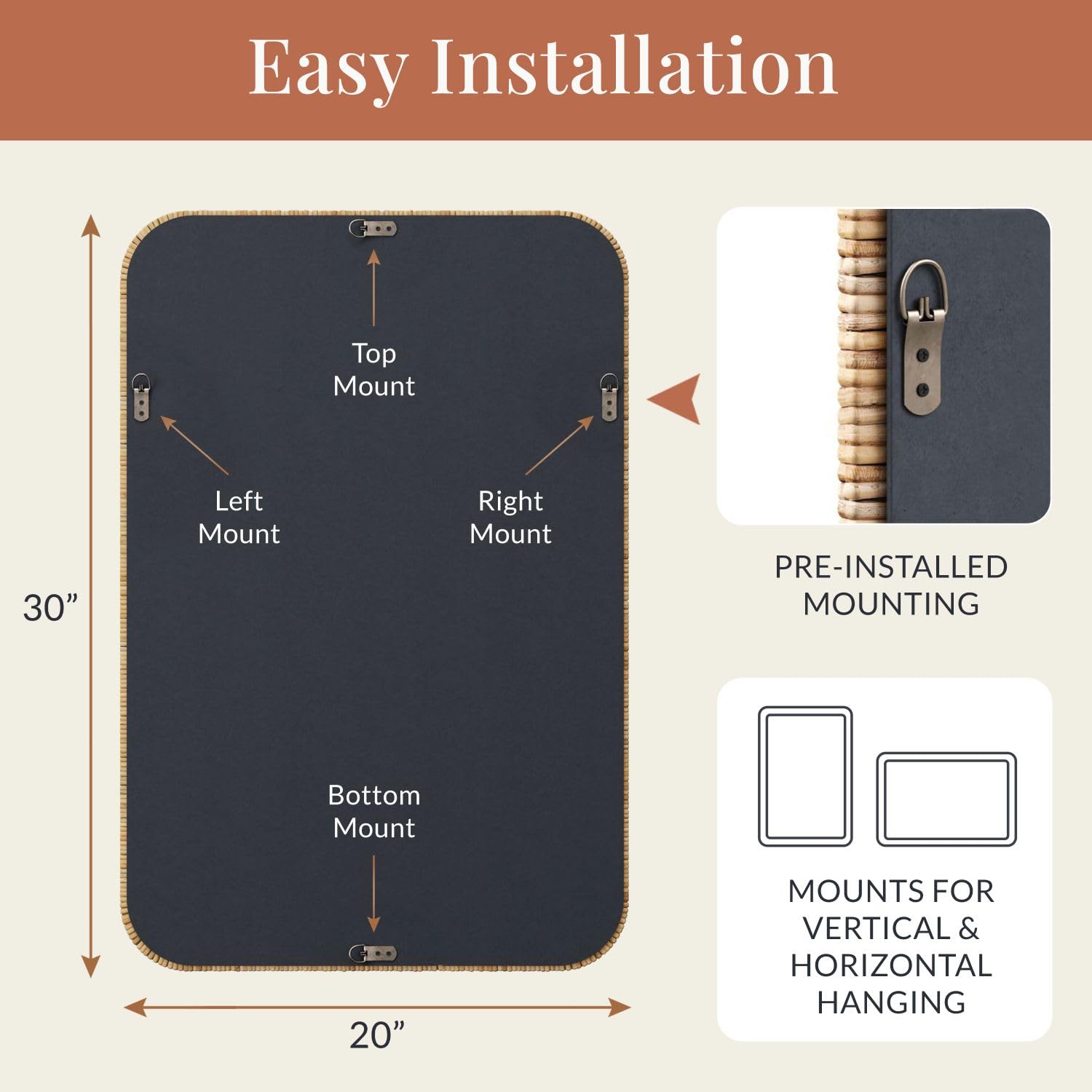 • Pre-installed wall mounting hook for vertical or horizontal hanging